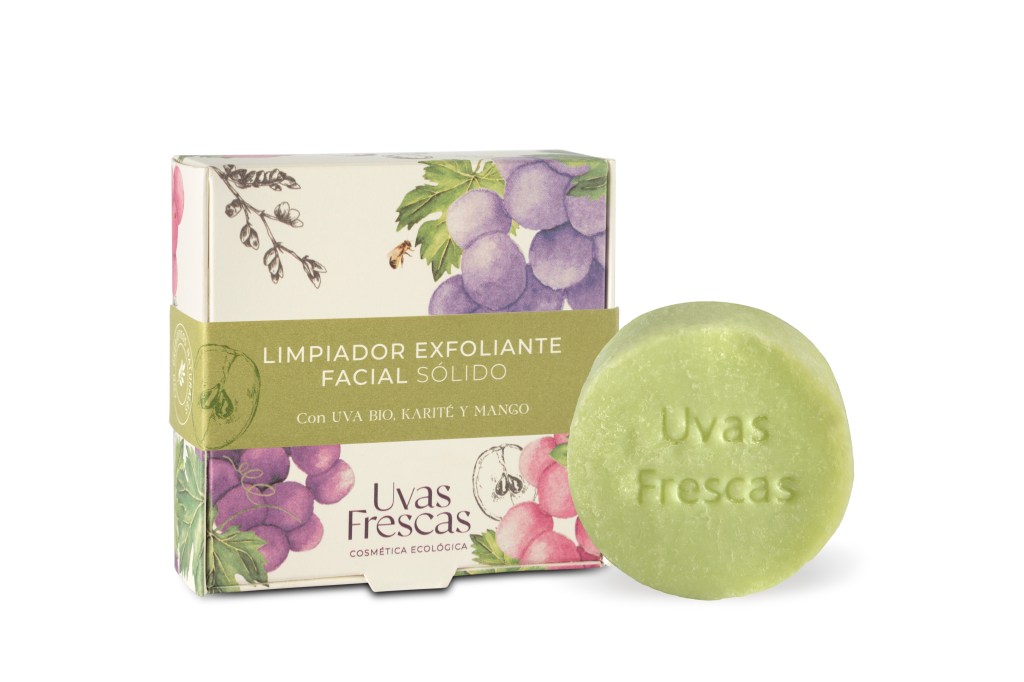 No te olvides de exfoliar la cara con el limpiador exfoliante facial sólido de Uvas Frescas, que exfolia suavemente la piel, purificando y afinando su textura gracias al aceite de uva bio, la manteca de karité y el mango. Contiene inulina, un prebiótico que restablece el equilibrio natural de la piel. Es ideal para la limpieza diaria de la piel del rostro.