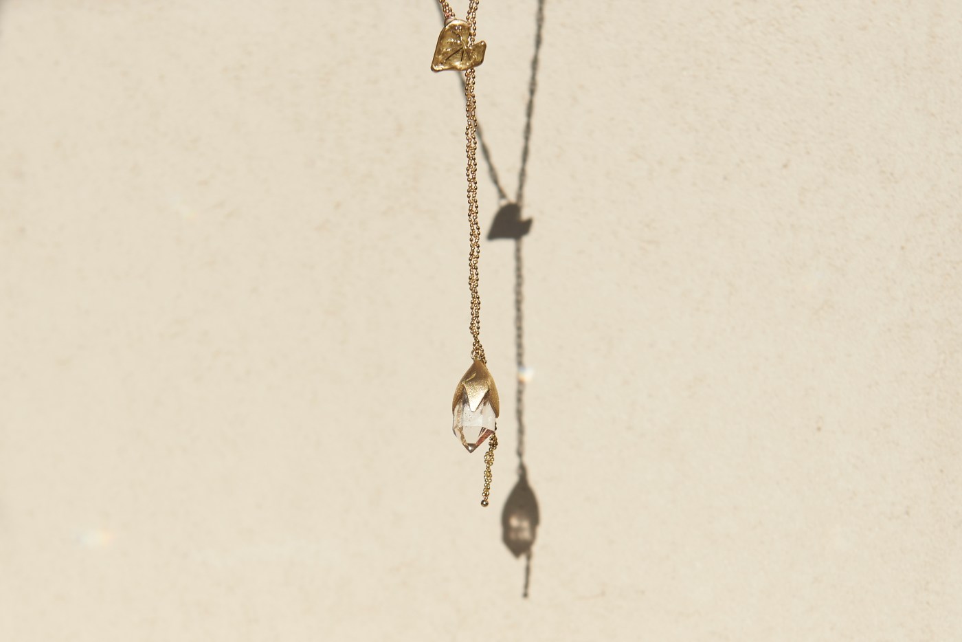 Leaves diamond herkimer quartz necklace es un colgante en oro reciclado 18k y diamantes HV-GS, con cadenas triples, sello SJ, la hoja tipo corazón lleva una chispa de diamante talla brillante HV-GS y el motivo se ajusta a través de la cadena para llevarlo combinado con otro colgante y jugar con las larguras, además de llevar al final el cuarzo herkimer con una capucha tipo hojas. Estos cuarzos actúan como guías/maestros para poder sentir tu camino y saber discernir lo que sí y lo que no.