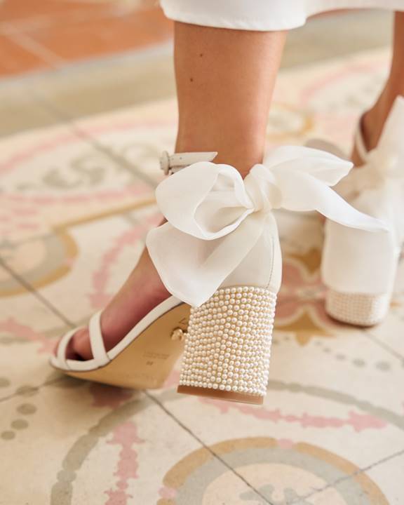 Para las novias más románticas, la sandalia Bianca 7 pearl, hecha a mano en España con fino cuero perlado y maxi lazo de organza en la parte de atrás. Llama la atención su tacón reluciente en bloque de 7 centímetros cubierto de perlas. Las sandalias Bianca ofrecen una lujosa combinación de estilo moderno y elegancia clásica. Unas sandalias que brindan una apariencia distintivamente romántica.