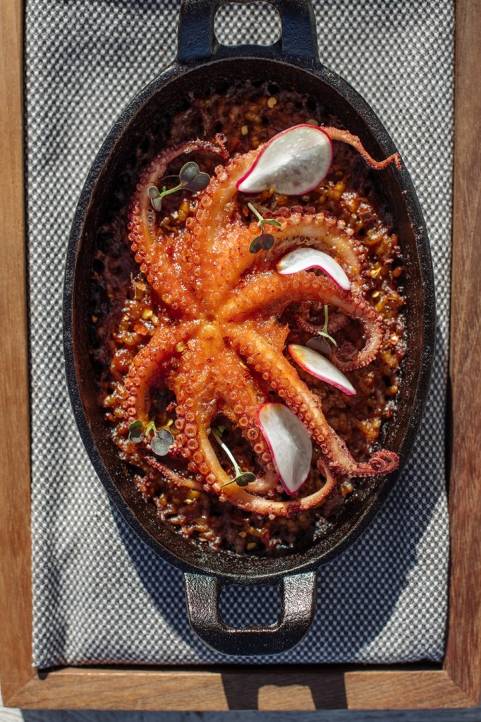 Además, en carnes también destacan la calidad de su “paletilla de cordero ecológico”, de la Associació de pagesos ecològics de Mallorca, y la “chuleta de vaca Madura”; y en pescados se da el gusto de trabajar con excelente producto local como el pargo, el rodaballo, el pulpo y el calamar, al que adereza con sobrasada mallorquina.