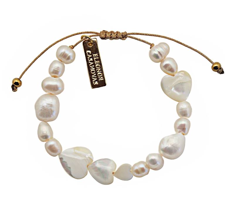 Hecha a mano combinando perlas naturales de agua dulce y corazones de nácar con cordón de macramé dorado. Perfecta para combinar con otras pulseras.