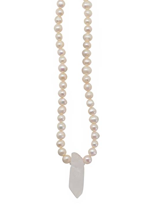 Un collar engarzado a mano con perlas naturales de agua dulce y piedra de cristal de roca de cuarzo en bruto con cierre de acero chapado oro 18k. Al ser piedra en bruto, presenta múltiples irregularidades e imperfecciones, lo que hace que cada collar sea único y exclusivo.