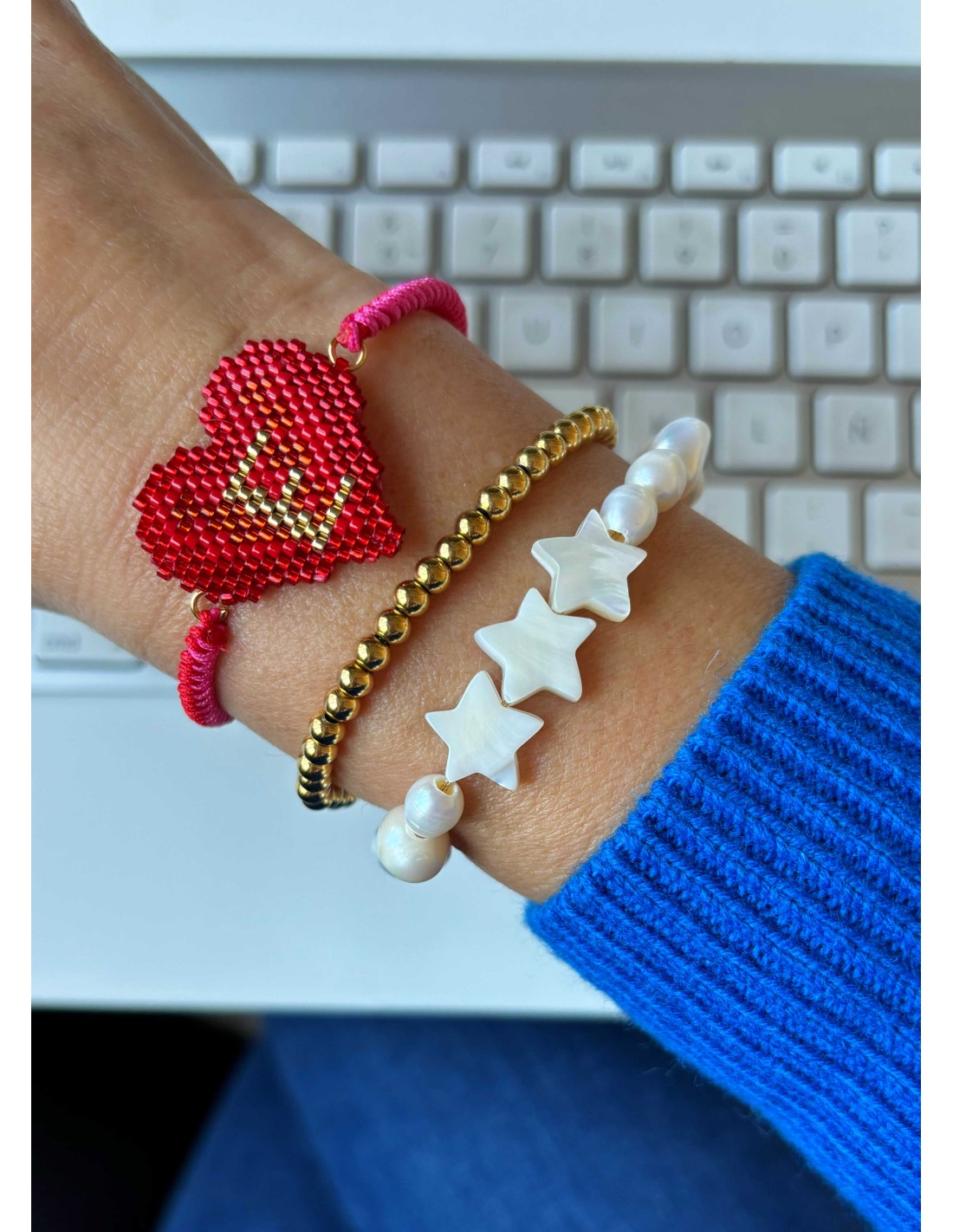 Una pulsera ajustable hecha a mano combinando perlas naturales de agua dulce y estrellas de nácar con cordón de macramé dorado. Nos encanta para combinar con otras pulseras y dar un toque de luz y originalidad.