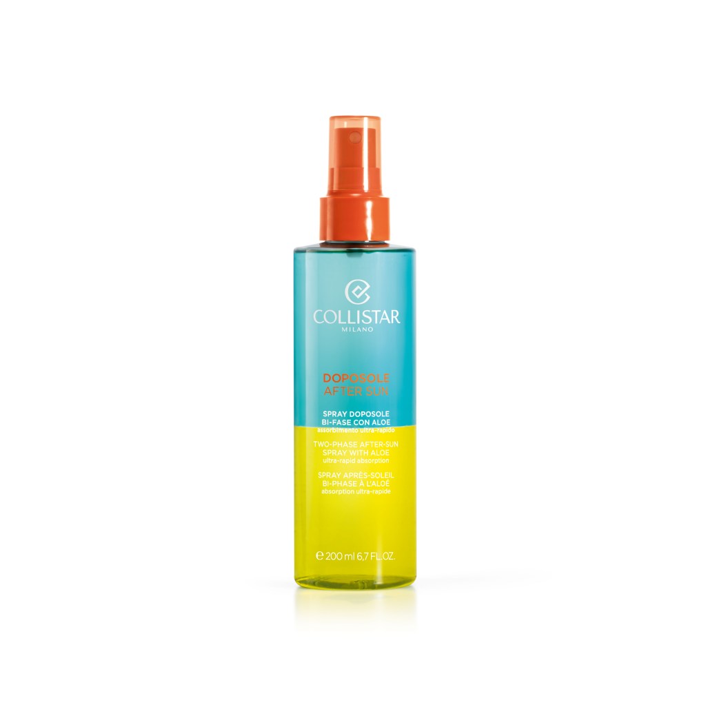El Spray Aftersun en dos fases de Collistar es un innovador aftersun, que debe agitarse antes de usar y que combina la riqueza de un aceite con la ligereza de un fluido. Se compone de dos fases, una oleosa y otra acuosa que, al mezclarse, dan lugar a un fresco preparado que se aplica en pocos instantes y se absorbe rápidamente sin dejar ningún rastro de untuosidad. Perfecto para quienes deseen un producto rico, pero no graso y de absorción inmediata. Combina los aceites de caléndula, macadamia y almendra dulce, nutritivos y elastizantes con una mezcla de sustancias super hidratantes, calmantes y refrescantes, entre las que destacan el aloe vera, que vuelven la piel sedosa y satinada al instante.
