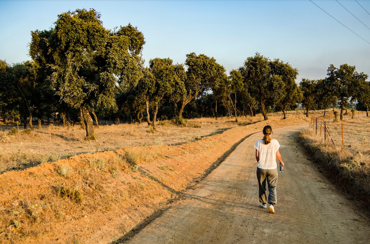 Durante el camino, dos guías profesionales especializados en naturalismo y bienestar muestran a los participantes la biodiversidad de la dehesa extremeña, repleta de grullas, alimoches y distintas rapaces; y de una flora presidida por grandes alcornoques, encinas, olivos centenarios e inmensas matas de jara, entre muchas otras especies.
