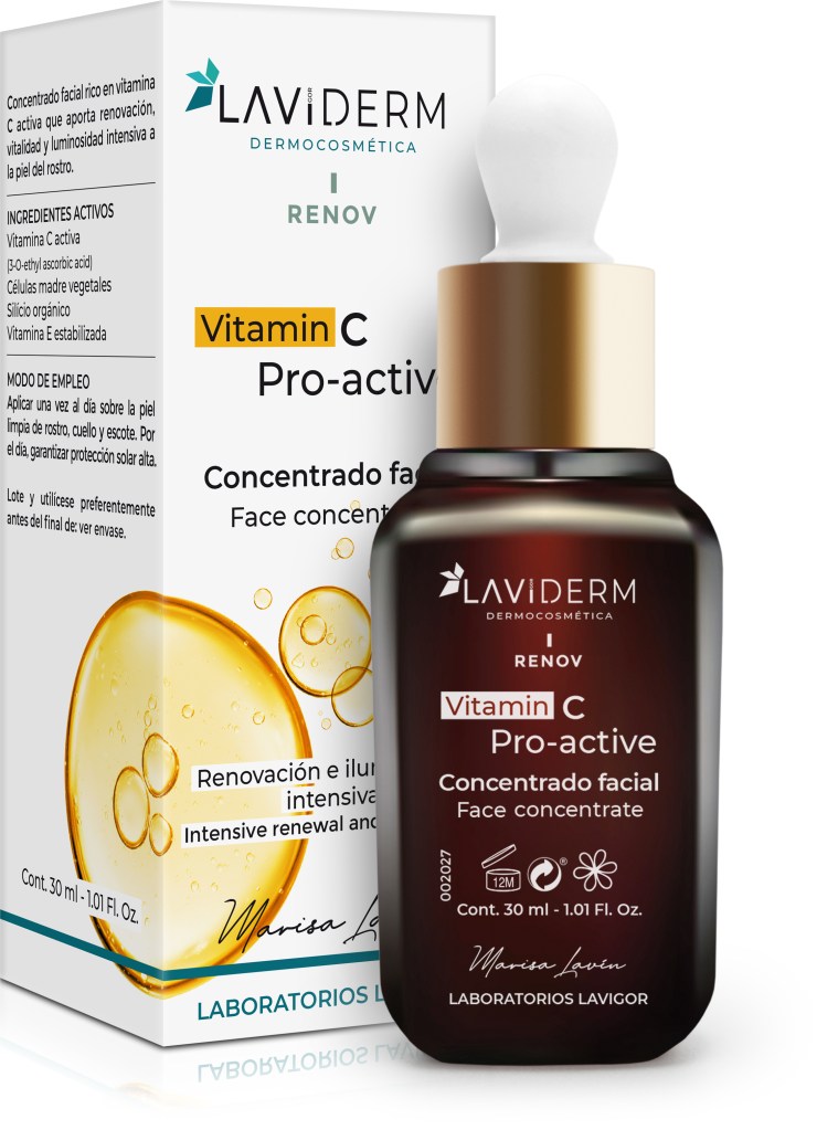 Vitamin C Pro-active es un concentrado facial de vitamina C activa, enriquecido con células madre vegetales, silicio orgánico y vitamina E estabilizada, apto para todo tipo de pieles y edades a partir de 30 años. Está especialmente indicado para ayudar a recuperar y mantener la vitalidad, la naturalidad, la suavidad y, especialmente, la luminosidad propia de una piel joven, características que, con el paso de los años y frente a factores como la radiación solar y la polución, se van perdiendo para dar paso a una piel carente de luminosidad, mate, más oscura, átona, con manchas y con mayor rugosidad.