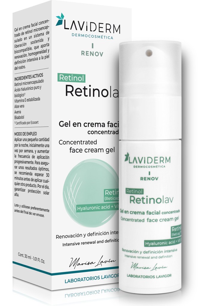 Retinolav de Laviderm, de venta en farmacias, es un gel en crema facial concentrado de retinol microencapsulado que posee un sistema de liberación sostenida y biocompatible (Reticap 10%). Está especialmente indicado para renovar, revitalizar y homogeneizar la textura y el tono de la piel, con el fin de disminuir los signos claros del envejecimiento asociados a: líneas de expresión, arrugas, flacidez, hiperqueratinización, manchas, pérdida de luminosidad y poros obstruidos.