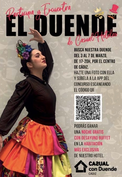 Desde el 3 al 7 de marzo, desde las 17:00 hasta las 20:00 horas, una gaditana ataviada con una falda y un tocado de colores, recorrerá las calles del casco histórico. Si la ves, hazte una foto con ella y súbela a la app del concurso que te puedes descargar escaneando el QR del cartel *. Podrás ganar una noche gratis para dos con desayuno en la habitación más exclusiva del hotel Casual con Duende Cádiz.