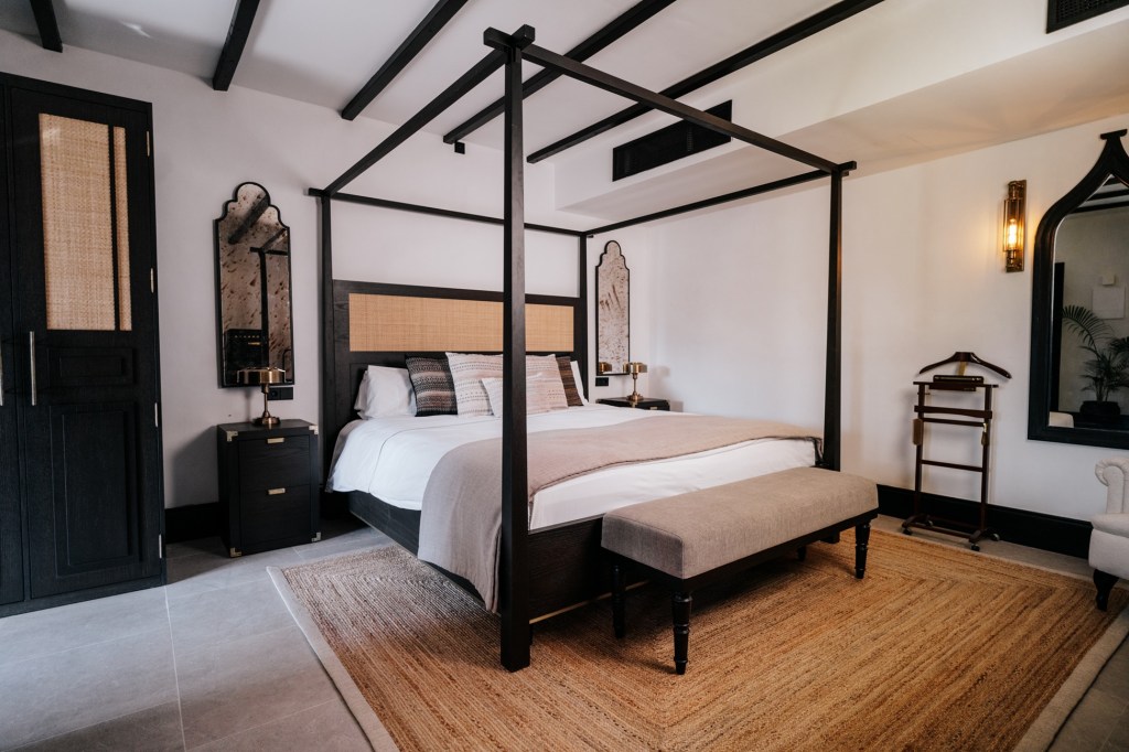 Un proyecto ecléctico que combina elementos tradicionales como las vigas de madera, elegantes doseles jalonando modernas camas king size y alfombras de fibra natural propias del estilo rústico mediterráneo; con muebles oscuros, espejos de estilo oriental y lámparas clásicas; para acoger a los más exigentes viajeros en un entorno mediterráneo de lo más sofisticado.