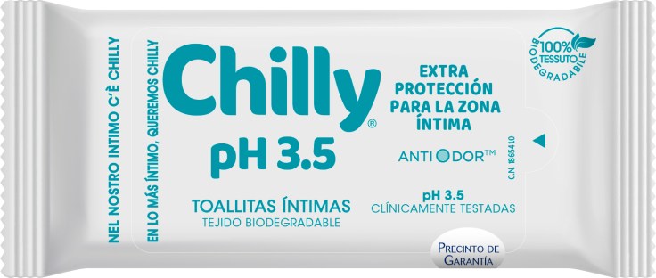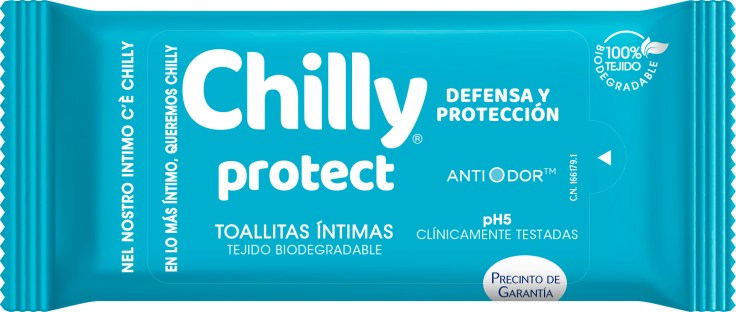 - CHILLY CALMANTE: están enriquecidas con Bisabolol, un agente dermocalmante que proporciona una agradable sensación de alivio de las pequeñas molestias íntimas diarias como el ardor y el picor, evitando así irritaciones y enrojecimientos.