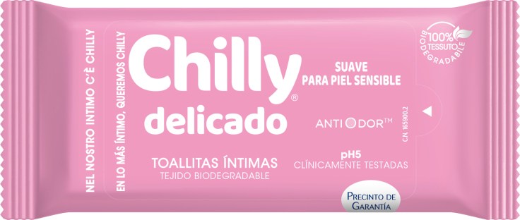 - CHILLY DELICADO: protegen el microbioma vaginal y proporcionan una sensación de delicadeza y bienestar durante todo el día. Perfectas para mujeres con pieles y mucosas sensibles ya que tienen una fórmula suave con Aloe Vera y Hamamelis.