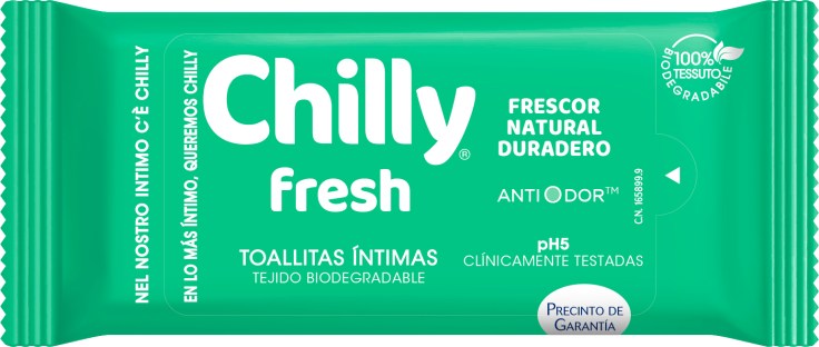 - CHILLY FRESH: proporcionan frescura intensa y protección duradera non stop, enriquecidas con Mentol natural, que da una sensación de vitalidad durante todo el día y respeta el equilibrio fisiológico de las mucosas genitales.