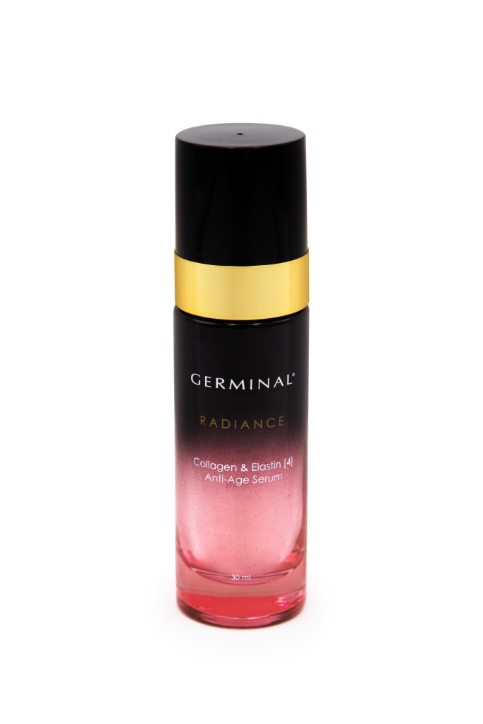 ● GERMINAL® RADIANCE COLLAGEN & ELASTIN [4] ANTI-AGE SERUM. Pensado para mujeres a partir de los 40 años preocupadas por la pérdida de firmeza, elasticidad y el desdibujamiento del contorno facial. Este sérum actúa de forma precisa sobre el llamado “triángulo de la belleza”, restaurando los volúmenes y ayudando a mantener una estructura facial armónica y definida. Gracias a una potente combinación de colágeno soluble e hidrolizado, precursores de colágeno como el nocotiana benthamiania hexapéptide-40 y bulbine frutescens, y elastina, este tratamiento nocturno trabaja intensamente durante las horas de descanso, mejorando visiblemente la firmeza +34 %, la elasticidad +21 % y reduciendo las arrugas -33 % en tan solo 28 días.
