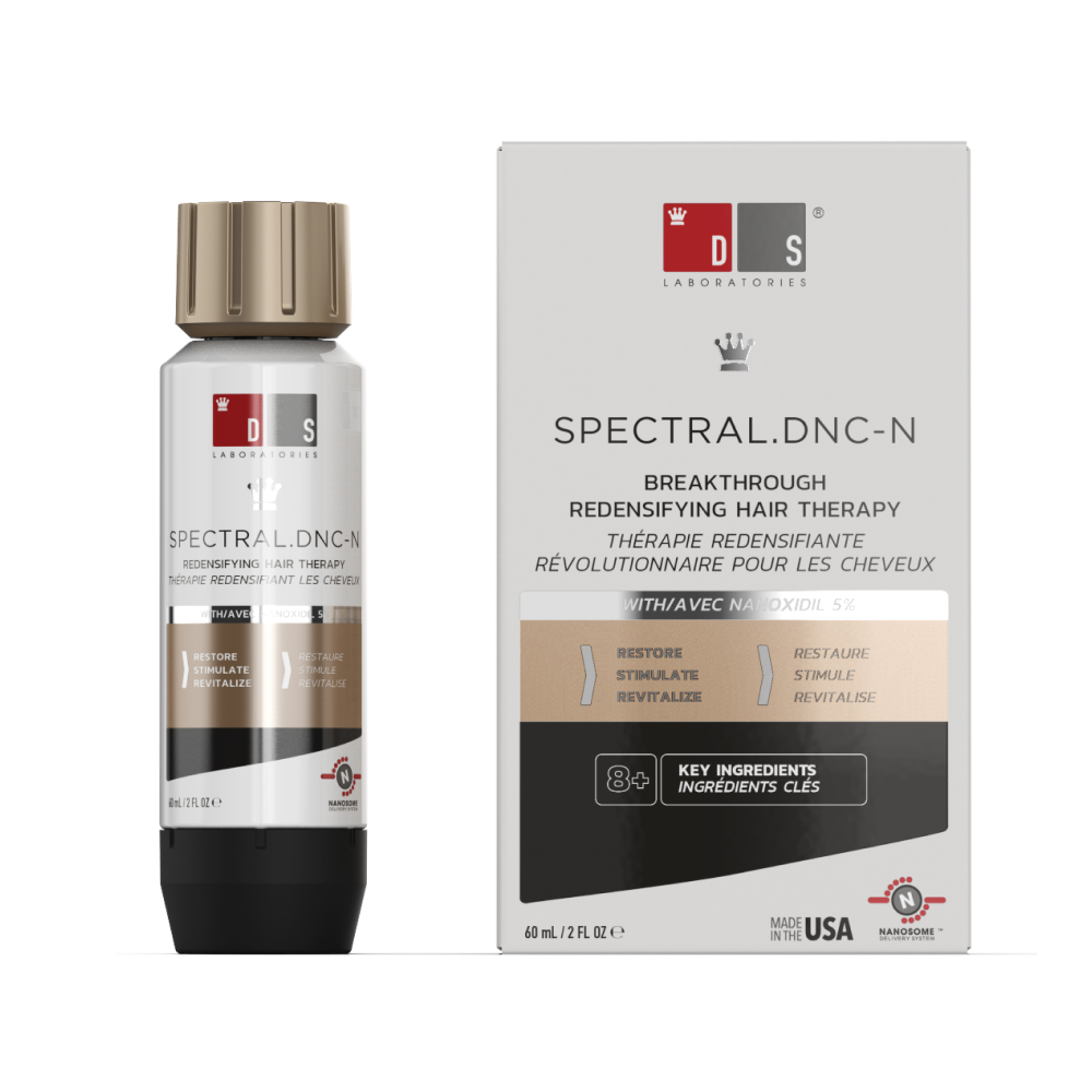 Se trata del primer tratamiento tópico para evitar la caída del cabello que utiliza Nanoxidil 5%, una poderosa alternativa al minoxidil tópico y sin efectos secundarios conocidos. En múltiples estudios clínicos se ha demostrado que SPECTRAL. DNC-N® ayuda a favorecer el crecimiento del cabello y ayuda a evitar su caída mediante la apertura de canales de iones dentro de las células; elimina la DHT (dihidrotestosterona, la hormona implicada en el adelgazamiento de los folículos); aporta efectos antioxidantes; prolonga la fase anágena de los folículos pilosos etc.